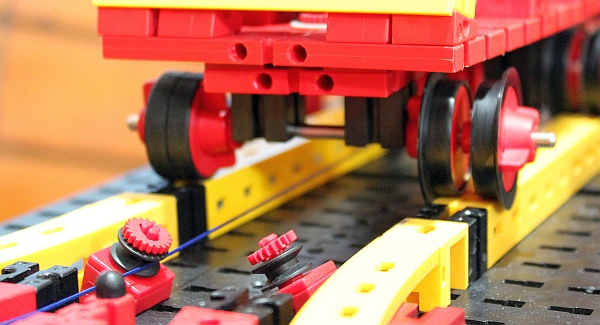 Die Weiche wirkt „passiv“, wird also nicht gestellt; die Steuerung übernimmt ein doppelter Radkranz, der den Waggon auf der äußeren Schiene hält. Florian Geerken hat 2014 die Karlsruher Turmbergbahn mit fischertechnik nachgebaut – und mit einer Abtschen Weiche ausgestattet. Das Ergebnis konnte auf der fischertechnik-Convention 2014 und dem FanClub-Tag 2015 in Waldachtal live getestet werden.