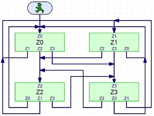 Ein solches Steuerungssystem ist auch unser fischertechnik TX(T) Controller.Zustandsübergänge können hier nur von einem der acht Eingänge (und ggf. angeschlossenen I²C-Sensoren) ausgelöst werden, daher muss ein Zustandsübergangsdiagramm, mit dem ein endlicher Automat beschrieben wird, maximal acht Zustandsübergänge berücksichtigen.