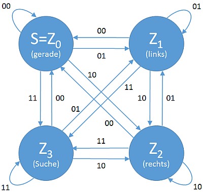 Die Zustandsübergänge im Zustandsübergangsdiagramm des Spurfolgers in der Abbildung werden vom fischertechnik-Spursensor ausgelöst: sind beide Werte 0, befindet sich der Roboter auf der Spur und kann geradeaus fahren. Wird einer der Werte 1, ist der Spurfolger nach rechts bzw. links von der Spur abgekommen, und der Roboter muss gegensteuern. Werden beide Werte 1, hat der Roboter die Spur verloren.