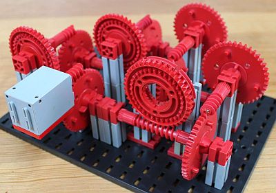 Packt man die Z40 noch etwas dichter, passen die zehn Untersetzungen sogar auf eine Experimentierplatte (für Nachbauer: hier gibt es eine fischertechnik-Designer-Datei des Modells von Dirk Fox aus dem Jahr 2013).