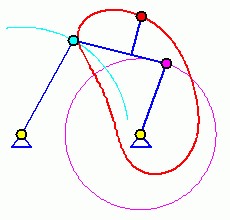 Und mit einem solchen einfachen Koppelgetriebe gelingt noch mehr: Ergänzt man das mittlere Element oder Koppelglied um einen „Koppelpunkt“ K (siehe Abb.), dann lassen sich damit raffinierte Bahnkurven beschreiben, in denen zudem die Bewegungsgeschwindigkeit variiert. Einige sehr schöne, anschauliche Beispiele findet man auf der Webseite zum Buch „Technische Mechanik“ von Jürgen und Helga Dankert.