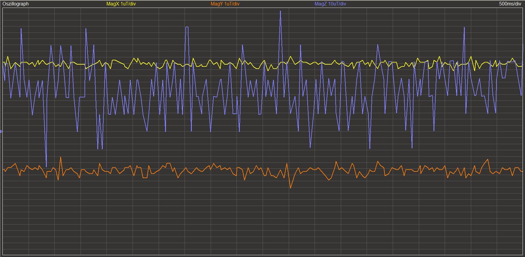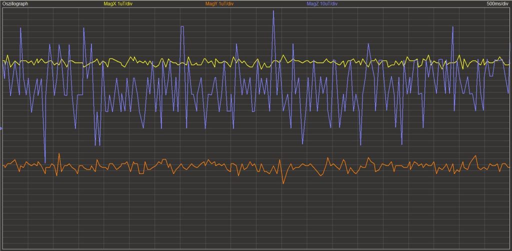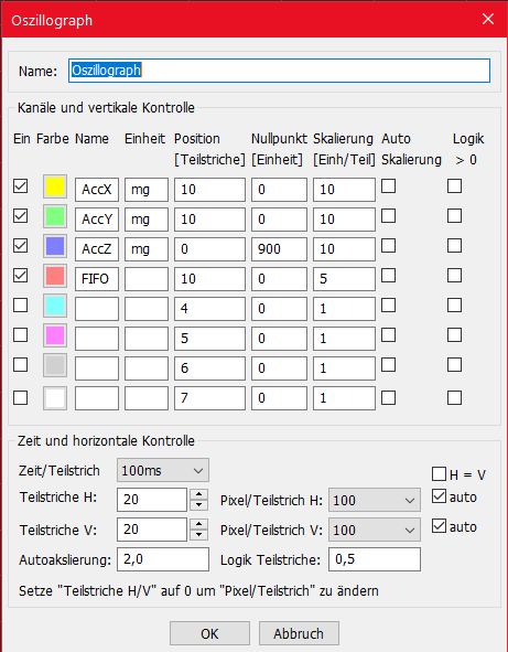 Verbindet man sich via WLAN oder Bluetooth mit dem Controller, können im Oszillografen auch Messwerte eines mobilen Roboters angezeigt werden. Die Skalierung der einzelnen Kurven wird im Kopf des Anzeigeelements in der Farbe der Kurve ausgegeben.