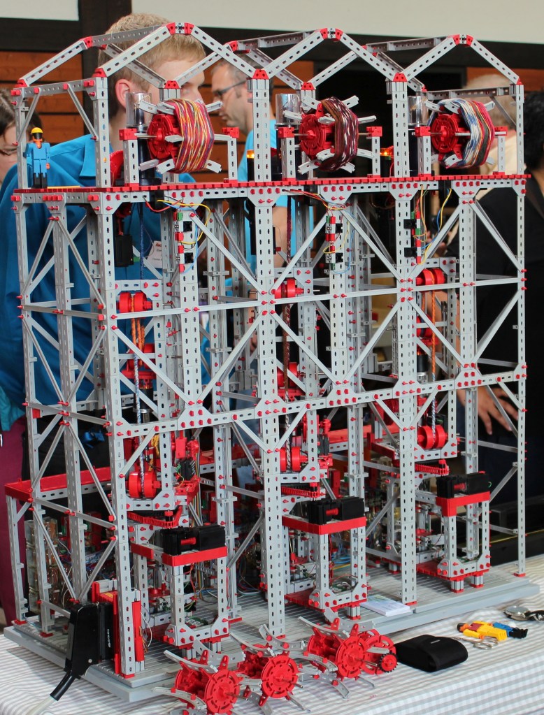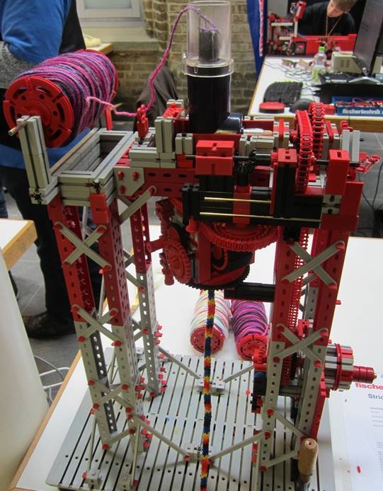 Bis heute lebt dieser Antrieb fort (wenn auch inzwischen einige Innovationen eher Lösungen für zuvor nicht existente Probleme zu sein scheinen) – erst recht bei einem wahren fischertechniker. Kein Wunder, dass auch das Thema „Strickmaschine“ irgendwann in ihren Fokus gerät. 2014 war die (meines Wissens) erste Strickmaschine aus fischertechnik auf der fischertechnik-Convention in Erbes-Büdesheim zu bewundern. Sie verwendete eine Strickmühle von Prym und wurde von Silberlingen gesteuert. Leider kenne ich den Erbauer nicht.