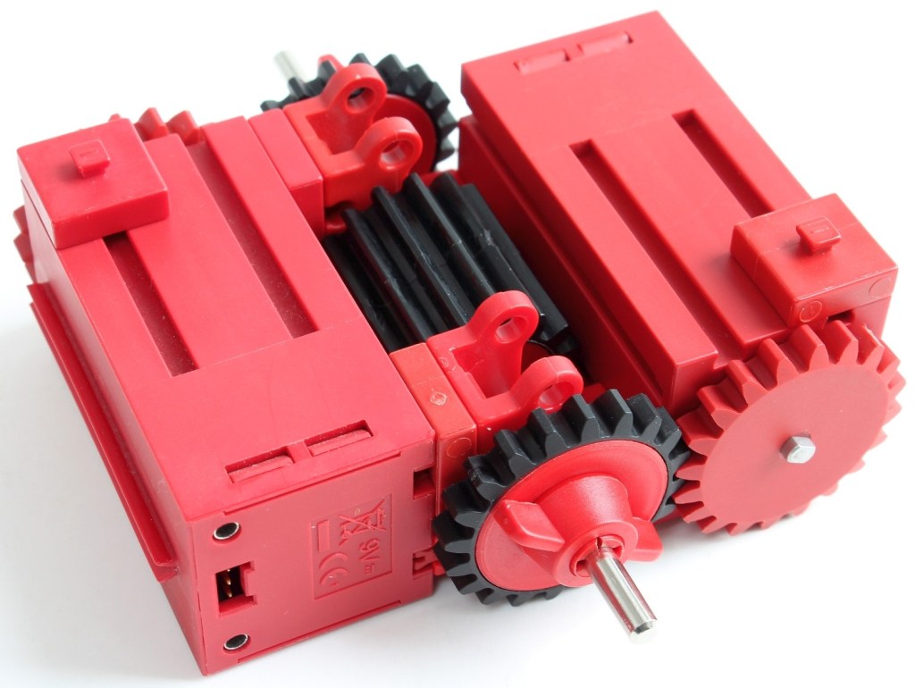 Ersetzen wir die Untersetzung durch eine 1:1-Übersetzung (Rast-Z20 auf Z20) und erhöhen wir außerdem Leichtlauf und Stabilität der Achsen durch ein altes Differential, steigt die Geschwindigkeit des Fahrzeugs prompt auf 52 cm/s. Mit 1,8 km/h immer noch keine Renngeschwindigkeit, aber immerhin. Die Geschwindigkeitssteigerung um mehr als das Doppelte verdanken wir dem Differential, das produktionsbedingte Unterschiede in der Leistung von je zwei benachbarten Motoren ausgleicht – bei der Originalkonstruktion bremst der Synchronbetrieb das gesamte Fahrzeug auf die Geschwindigkeit des langsamsten Motors.