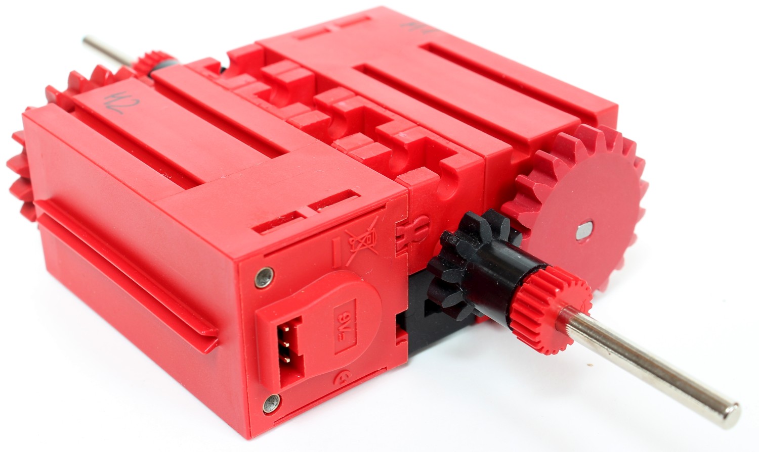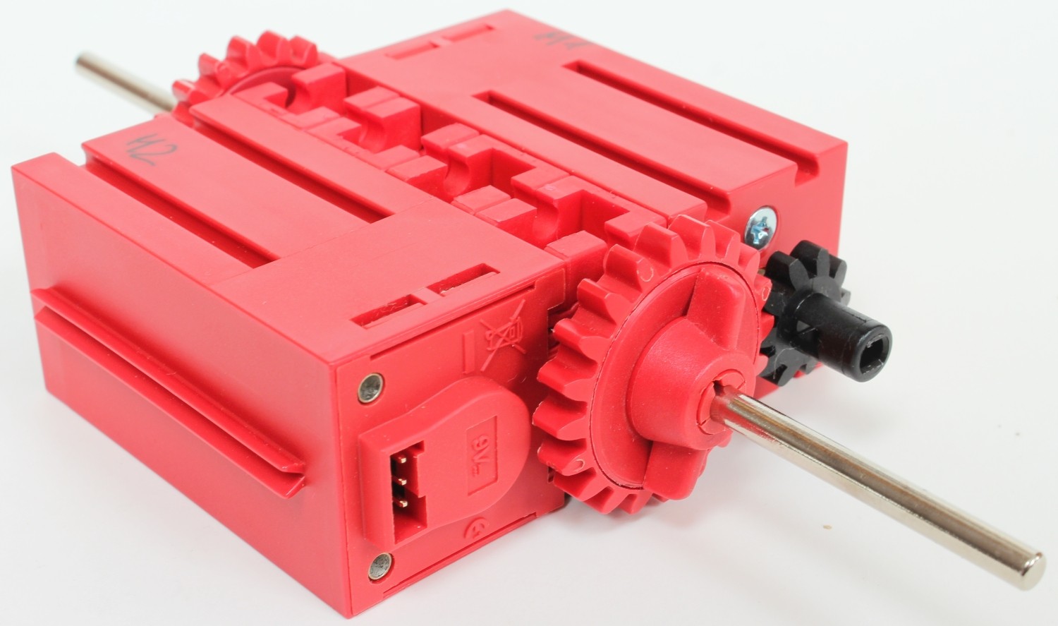 Ersetzen wir die Untersetzung durch eine 1:1-Übersetzung (Rast-Z20 auf Z20) und erhöhen wir außerdem Leichtlauf und Stabilität der Achsen durch ein altes Differential, steigt die Geschwindigkeit des Fahrzeugs prompt auf 52 cm/s. Mit 1,8 km/h immer noch keine Renngeschwindigkeit, aber immerhin. Die Geschwindigkeitssteigerung um mehr als das Doppelte verdanken wir dem Differential, das produktionsbedingte Unterschiede in der Leistung von je zwei benachbarten Motoren ausgleicht – bei der Originalkonstruktion bremst der Synchronbetrieb das gesamte Fahrzeug auf die Geschwindigkeit des langsamsten Motors.