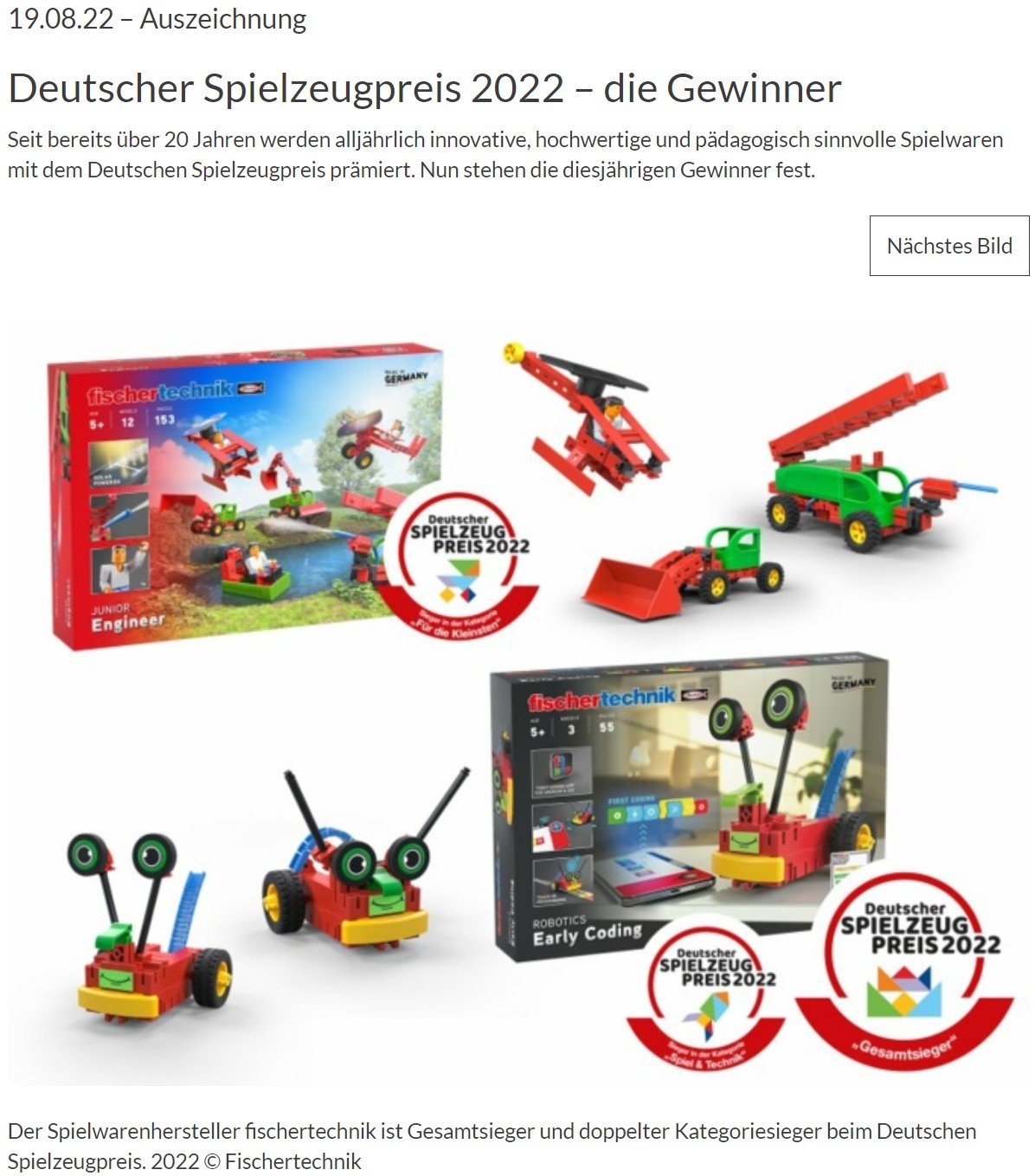 Das Spielzeug überzeugt Jahr um Jahr die Jury des Deutschen Spielzeugpreises – und wurde am 19.08.2022 sogar in zwei Kategorien („Für die Kleinsten“ und „Spiel und Technik“) Kategorie-Sieger, sowie obendrein noch als „Gesamtsieger 2022“ ausgezeichnet.