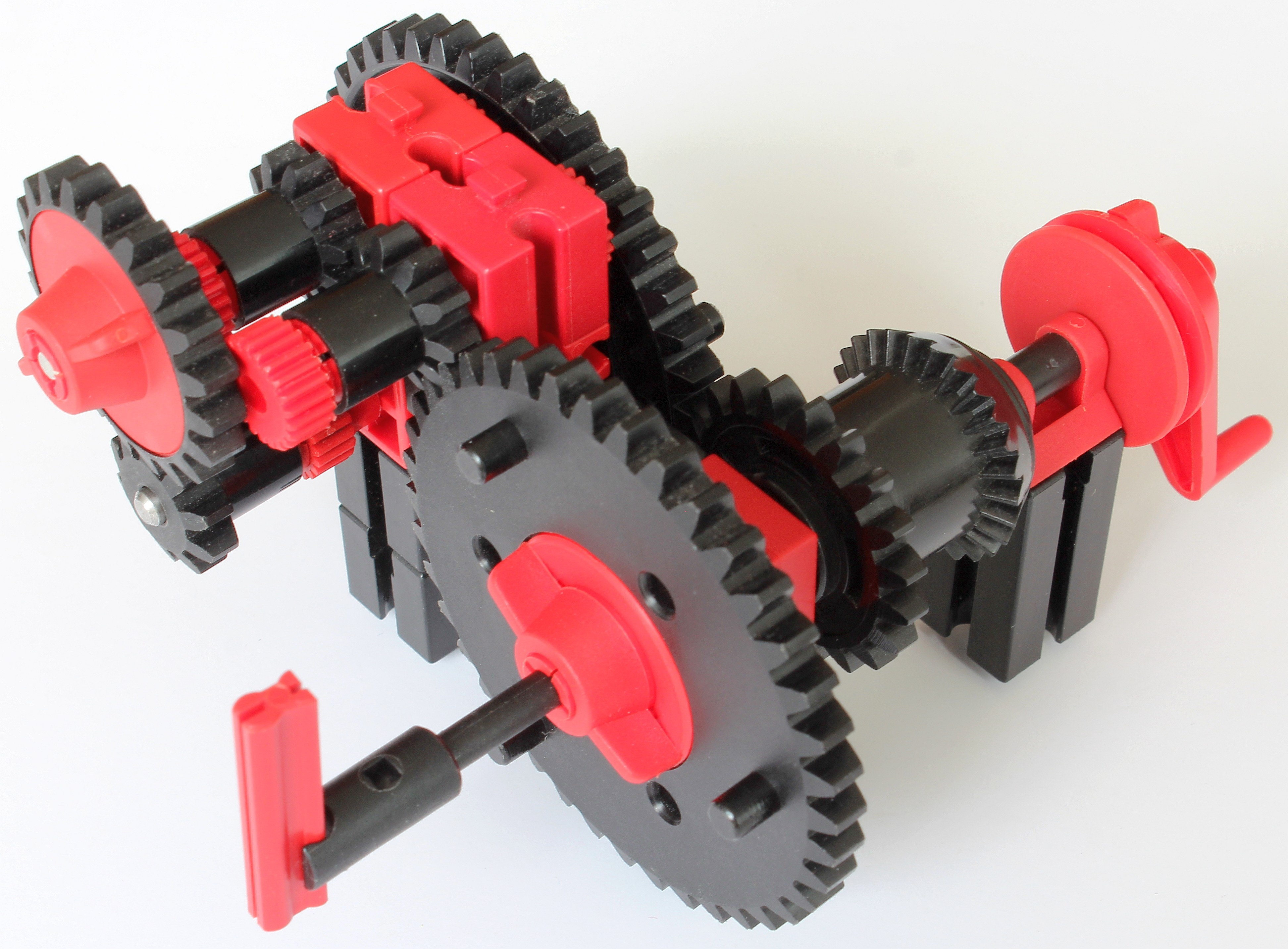 Auf diese Weise lassen sich z. B. Getriebe für ein Planetarium [4] konstruieren. Tatsächlich kann so jedes ganzzahlige Übersetzungsverhältnis als Getriebe konstruiert werden. Das resultierende Getriebe ist meist nicht die kompakteste Lösung – aber es lässt sich mit fischertechnik-Zahnrädern aufbauen, und hat dank der „Rückkopplung“ zwischen Differentialkäfig und Abtriebsachse praktisch kein Spiel.